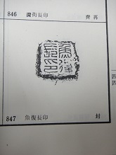 ・右‐p.144‐封泥‐「魚復長印」、魚復‐(p.716‐大漢和辞典・諸橋轍次著・大修館書店・巻12‐  【魚 復】ギョフク‐縣名。秦、置く。山によつて城をなす。赤岬城。四川省奉節縣の東北。  〔漢書、地 理志上〕巴郡、縣十一、魚復。、、、)
