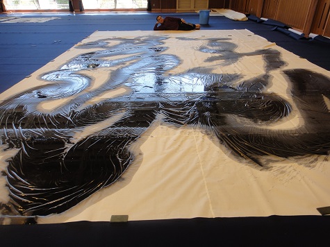 下図、15日の書法研究会にて、山本さんの大作、奥に筆者本人横たわる、