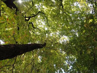 パリ9/5、チュイルリー公園の木陰にて休憩、椅子から見上げると太陽に向かっている幹、枝、葉、、、そしてその樹の地面の下には、樹の要請を支えようとしている根、柢が、、、生きている。