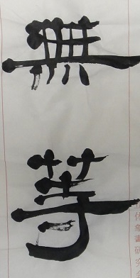 ・左、顔真卿-争坐位稿-- 3D CALLIGRAPHY-習作「無」-右側面、始筆より部分(行書)、  ・右、(半紙臨書)-木簡より -無等- (隷書)、 (32)・・・p.11.12-「顔眞卿の書學」- 、、、宋の蘇東坡は云う「顔魯公の書は雄秀獨出し、古法を一變す」(題唐代六家書後)と、東坡又云う「書の美なるは顔魯公に如(し)く莫し、然れども書法の壞は魯公より始まる」(漁隱叢話前集巻三)と。、、、(靑木正兒)-とある。-書道全集第10巻 中國.唐Ⅲ.五代 昭和31年發行 平凡社・・・