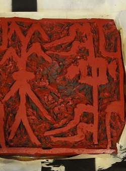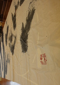 作品(5.4m×22m)やっと完成!二日がかりの押印、 約一尺の朱文印