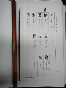 十一 魚部 p.466の魚字、左に発見された「筆とそのケース」の複製品を置く