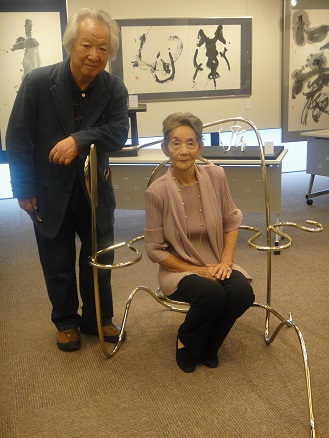書を書くという三次元の書、二次元の書、書の表現の「有と無」ともども鑑賞していただきました。可比丹(カピタン)作品・「母」字・タイトル「クレオパトラが座れなかった椅子」に座る、、、下図、この展示会のために