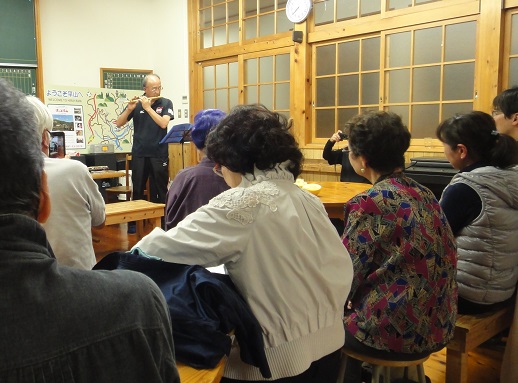 ・下図-初日夕食後の特別講座-篠笛の世界-を堪能、奏者の下條さん-先月国立劇場でも演奏-皆さん大拍手・・・配布資料(36)、、、空書とは胸中用筆法を蔵して空中で運筆のリズムを味はふことである。良寛禅師は早朝起きて草庵を清掃すると、山上の大空に向って右手を揮ひ空書したといふ。これはラジオ體操よりよいかも知れぬ。一挙両得である。彼の書が運筆のリズム感に豊かなのはそのためであらう。、、、とある、-書について 書論双書8 田邊萬平著-