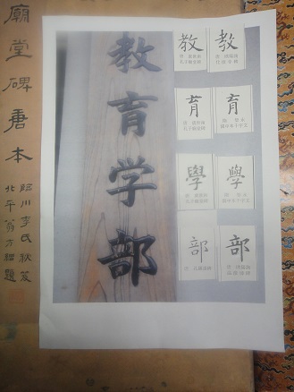 下図、「教育学部」と刻字された看板、、、教育とは、-人間というものをつくる芸術である-然り。、、、どうだろうかこの看板、....書を究めるといふ事は造型意識を養ふことであり、とは(高村光太郎).....、この看板の書から、古典の筆意が見てとれるのだろうか、、、右に貼り付けた8字、ー唐・虞世南・孔子廟堂碑、欧陽詢・化度寺碑・温彦博碑、孔穎達碑、隋・智永・関中本千字文ー、