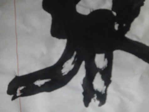 下図、羊毛筆長鋒の濃墨「捩じり」による墨線‐木簡「不」字臨書‐下部、