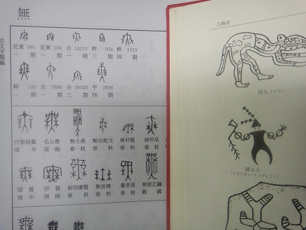 ...陶器なのかはわからないが、踊っている人の右手に持っている「もの」の形を表現したものと、古文字類編「無」字の甲骨文の両手に持っている「もの」の形を表現したものは似ている。「無」字は、‐ム・ブ・ない・まう ‐仮借‐ もと象形で、人の舞う形。のち無に両足をつけた舞(ぶ)が舞楽の字となり、無は専ら有無の無、否定の詞に用いる。すなわち仮借字である、、、という、‐p.816‐字統‐白川静‐平凡社.....