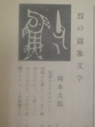 殷書はもちろんのこと、中國の古典について全く無知なのだから、と再三ことわったのだが、「それで結構ですから、まあ御覧下さい」と殷書の拓本一册を手渡された。ぱらぱらつとめくつてみたら、奇妙だが逞しく、全くたのしいイメージがピョコピョコ躍り出て、私の全神經をたたいた。や、こいつは面白い、この本しばらく手もとにーーと、うつかり口に出した。すると「では何日までで結構ですから、お願いします。」とうまくのつてしまつて、ついこの原稿を引受けた形になつてしまつた。、、、とある(岡本太郎氏)「圖象文字」について、つづく