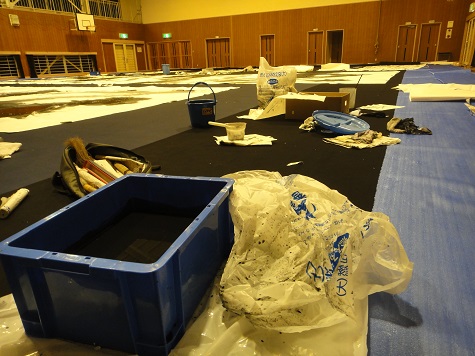 ―作品制作、下敷きの長さ25メートル、休憩中の会場―
