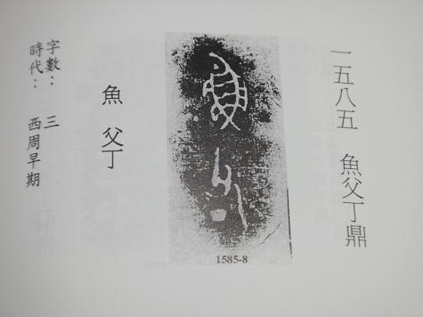 魚父乙]この鼎の拓図―中国社會化學院考古研究所編 「殷周金文集成釋文」 第二巻 香港中文大學中國文化研究所 出版― 八十二頁に、 ‐ [魚父乙鼎] ‐ 時代:西周早期 とある。