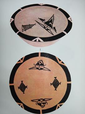 中原地區動物紋形象來装飾陶器的、以半坡類型最爲突出。早期多象形的人面魚紋和以魚、鹿、蛙、羊爲對象的装飾。人面魚紋的紋様組合、反映一種極爲原始的圖騰氣息。、、、魚、作爲素材在半坡彩陶紋様中、可以説是極盡變化之能事。它從描繪有鱗片的魚寫生起、到便化爲抽象的魚形圖案、這中間運用的装飾手法多種多様。在發表的數十種描寫”魚”紋様的陶器和砕片上、我們可以看到一尾魚形象、是怎樣經過繪製者的便化而達到這樣装飾的圖案効果的。即使是一個魚頭、雖然寥寥數筆、而魚的神卻鈎畫得十分生動、具體而精微。在描繪數條魚並行時、魚的行列充満生氣:而將這樣的行列再加以便化、就變成爲既有對稱規律又富有生動感的圖案。