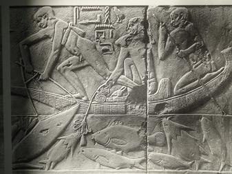 図版96、庶民の生活、「魚とり」・第6王朝前半 ・B.C.2345-2280年頃 ・浮彫り ・彩色 ・サッカーラ ・カゲムニの墓、p.128.129・・・それらは、死者が墳墓の中で来世の生活のために必要とするものを、死者のためにつくってやることであった。そして単にパンとビール、鳥獣、舟や穀物容器を模写するだけでなく、パン焼きと酒づくり、鳥の捕獲と獣狩り、造船と畑仕事などを描き出そうとした。それから墓主を楽しませるために、舞踏、音楽、子供の遊戯などを加えて、墓主の来世における生活をいっそう楽しませる努力がみられてくる。第5王朝の末以来、死者の現世における生活の中からの事件を一つ一つ描いていくようになった。そして記念物として子孫たちにこれを知らせようとする意図がみられてきた。・・・「カゲムニ」という神官の味わった趣味は「魚釣り」でもあったといえよう・・・B.C2345‐2280年頃の浮彫り彩色表現・・・