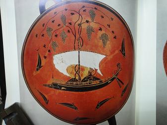 p.98、大型酒杯の中央を占める船の上には、木蔦の冠をかぶり、豊穣角を手にした半裸の酒神ディオニュソスが片肘をついて横たわる。船は魚頭形のとがった舳先から白鳥の首をかたどった艫にかけて弓なりの曲線を描き、白い帆は、酒神の頭上で大きく風をはらむ。帆柱には葡萄の木がからみつき・・・船のまわりを群がり泳ぐ7匹の海豚(イルカ)は、この場面全体が海原であることを暗示している。同時にそれは、ディオニュソスがアッティカで葡萄の栽培を教えたあとナクソス島に渡ろうとしたとき、彼を奴隷に売ろうとしたテュレニア人の海賊たちを魔法でイルカに変えたという伝説とも関係があるのかもしれない・・・作者エクセキアスは僭主ペイシストラトス時代に活躍した黒絵式最高の画家である。彼は好んで英雄伝説をとりあげ、その叙事詩的表現の中で神や人間の荘重、崇高、悲壮をあらわそうとした・・・