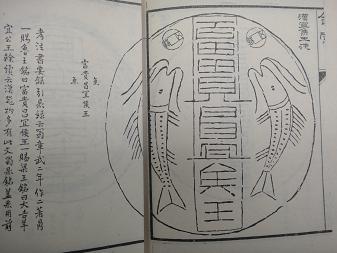 金石索 上 p.326.327、‐ 漢宜侯王洗 ‐ 両魚の中に、富貴昌宜侯王の6文字、