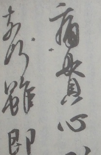 ・・・p.37、、、互いに全く無関係であり、いかなる内部空間も慎重な造型の結果とは思えない。「喪乱帖」では、一字中のすべての構成部分は一つの視覚の単位に統合されている。「心」の点画はみな実に個性的な形をもっている。しかし、それらが全体として、よく均斉のとれた一つの構成を生み出している。「李柏尺牘」の同じ字は、造型的にはっきりしない点の組み立てのように思える。、、、 とある - 米芾「人と芸術」 L.レダローゼ著.塘耕次訳 一九八七年発行 二玄社・・・