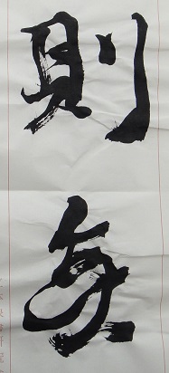 ・左、顔真卿-争坐位稿(-無-)- 3D CALLIGRAPHY作品-作品題名「無為」-上面より、 -立体象書は、筆意を摑み出した瞬間から正面・側面・上面の存在がある-、 ・右(半紙臨書)-貫名菘翁 翻刻左繍叙より 草書-則無-、 ・・・-むすび- 、、、すなわち「一なる全体の細部」になるのでなければならぬ。書く動きが一つの動きでありえたときのみ、このことが成り立ち、障わりのない静かな世界がはじめて開けるのである。、、、とある、-近代の美術28 書と墨象 森田子龍編 昭和50年発行・・・