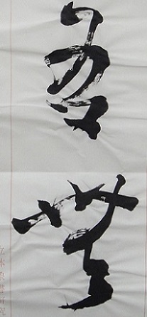 ・左、顔真卿-争坐位稿-無-、3D CALLIGRAPHY作品「無為」-後面より、 ・右、王羲之 独坐帖より 草書-吾無-・・・-むすび- 、、、さきに「点を打つ心」にふれて語ったように、筆を持つ手における抑える力はつねに引きあげる力と一つにはたらかねばならぬし、同様に、進む力はその逆の力を常に内に含みもっていなければならぬ。また外に押し出し広がり出る力は、、、とある、-近代の美術28 書と墨象 森田子龍編 昭和50年発行・・・