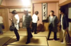 畳が敷いてあり床の間には書が掛けられています、熱心に書を見る会員の方、、、中の様子