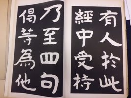 拓本は、石刻凹凸のそのままの実寸と白と黒の反転の面白さです―筆意を刀で刻した石刻、線表現に、紙をあてて上から拓包(タンポ)で筆意を叩き出します。紙面は墨で黒くなり、なにもない白い部分が毛筆の線表現になるわけです―陽刻の場合はその逆です。実物よりも拓本のほうに味わい深い場合もあります。