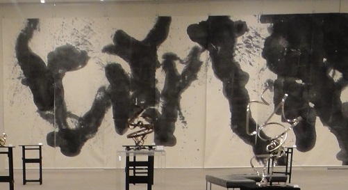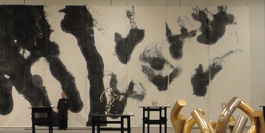 ・-「現在」は移動する「無窮」- 作品「群黎移動」(5.4m×22.8m)甲骨文「渉」字-(サンズイは河)、(アユムは歩)、「河を渉って旅に行くのは一人ではなく、われら(群黎)」による