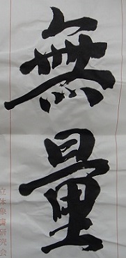 ・左、顔真卿-争坐位稿 行書体(-無-)より、- 3D CALLIGRAPHY作品-作品題名「無限」- 習作部分、 -立体象書には、古典(書)を摑み出した瞬間に、正面・側面・上面という筆意が存在する-、 ・右(半紙臨書)-傳橘逸勢 三十帖冊子 -無量-、 ・・・p.10-「象」への夢―天来- 、、、「如」「象」へ想い及んだのである。残念ながら実際の作品は得られなかったが、墨象はかくしてたしかに胚胎したのである。明治以来、少なくとも六朝書ショック以来の道程がその母胎であったというべきであろう。-とある。-近代の美術28 書と墨象 森田子龍編 昭和50年発行・・・