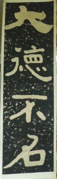 拓本は、石刻凹凸のそのままの実寸と白と黒の反転の面白さです―筆意を刀で刻した石刻、線表現に、紙をあてて上から拓包(タンポ)で筆意を叩き出します。紙面は墨で黒くなり、なにもない白い部分が毛筆の線表現になるわけです―陽刻の場合はその逆です。実物よりも拓本のほうに味わい深い場合もあります。